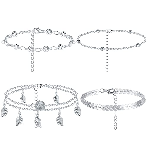 Yaomiao 4 Bracciali alla Caviglia Boho Regolabili Catene del Piede a Foglia di Perline a Strati Gioielli a Piede Cavigliera per Donna Ragazza Accessori Spiaggia Estate Regalo (Argento)