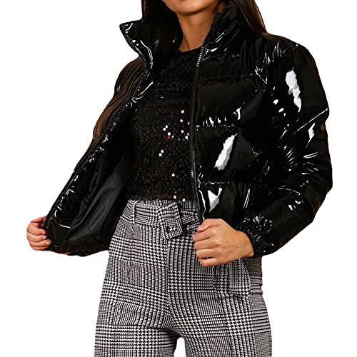 YAOTT Piumino Parker Con Cerniera Da Donna Manica Lunga Colletto In Piedi Piumino Corto Superficie Lucida Calda Tinta Unita Inverno Giacca In Cotone,Nero,M