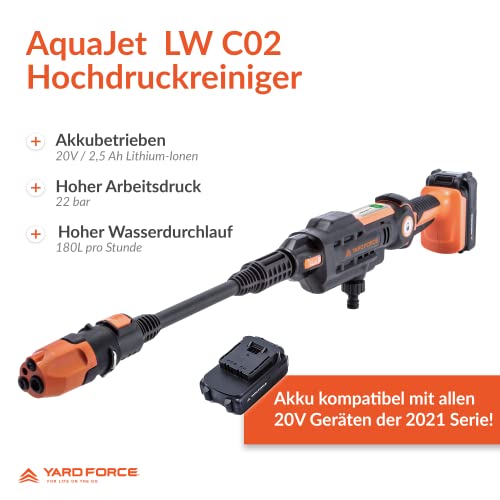 YARD FORCE 20V AquaJet Idropulitrice - con batteria da 20 V / 2,5 Ah, caricatore rapido, max. 22 Bar