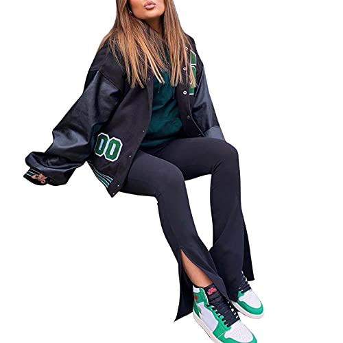 Yassiglia Giacche da Baseball Oversize da Donna Giacche da Ricamo con Lettere a Maniche Lunghe in Pelle alla Moda Giacca Y2K da Donna (Nero Verde, M)