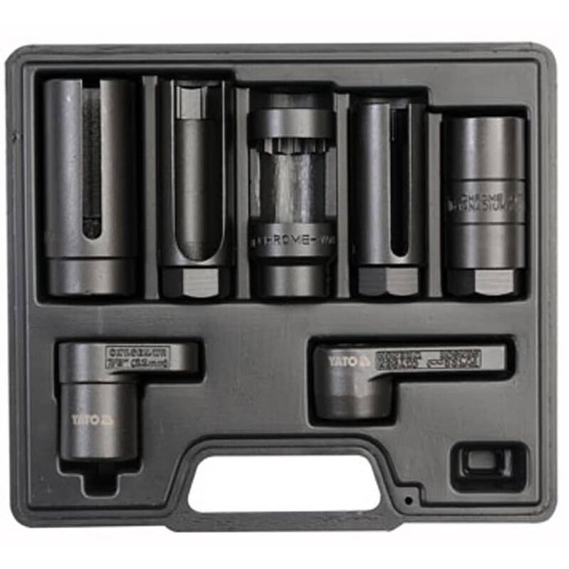 Le teste hanno forma speciale e slot per svitare i sensori e gli iniettori senza rimuovere i cavi. I tappi per sensore lambda sono destinati ai comuni modelli di marchi automobilistici: VW, Audi, BMW, Mercedes, Ford, Opel, Peugeot, Citroen, Renault, Seat, Skoda. Le teste per iniettori adatti per le marche automobilistiche: BMW, Ford, VW, Mercedes. Il kit è consegnato in una scatola soffiata. Numero di elementi: 7 Materiale: Lega di acciaio CrMo SCM-440 Dimensioni guida: 12,5 mm e 10 mm (1/2 e 3/8) Tappi per sensore lambda (ossigeno): 22 mm Tappi per iniettori: 22 mm, 27 mm e 29 mm SKU: 401868