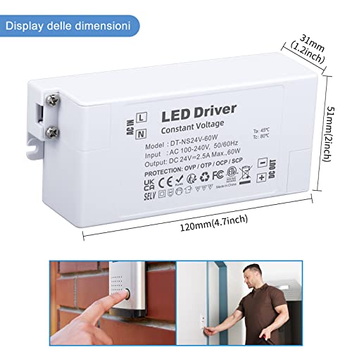 YAYZA! Alimentatore 24V 60W, Trasformatore 220 24v Piccoli, 2.5A Trasformatori a Bassa, Pressione Costante LED Driver Per Doorbell Ring, MR16, GU5.3, Lampada Ring e Lampadine a LED