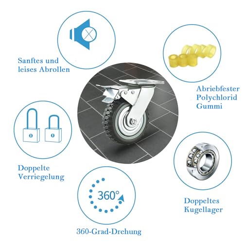 Costruzione durevole: le ruote Caster da 150 mm sono realizzate in ferro zincato e durevole e ruote in policloruro di alta qualità, resistenti all'usura, resistenti allo sporco e antiscivolo e ammortizzanti, supportano facilmente fino a 200 kg per set.