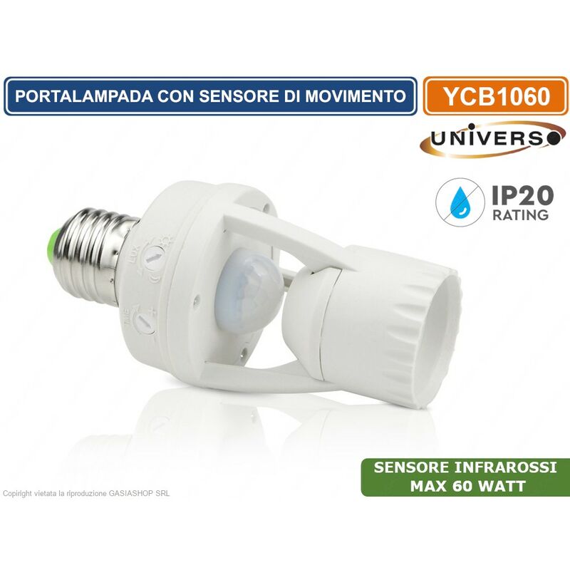 Portalampada con attacco E27 adatta per uso interno con grado di protezione IP20. Dotata di Sensore di Movimento e Sensore Crepuscolare che permettono di variare il tempo di accensione e l'intensità della luce ambientale. Compatibile con tutte le lampadine LED E27 con potenza massima di 60W. Il sensore di movimento, installato ad un'altezza variabile tra i 2 e i 3,5 m, ha una distanza di rilevamento di 6 metri