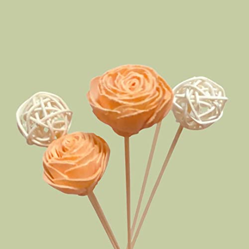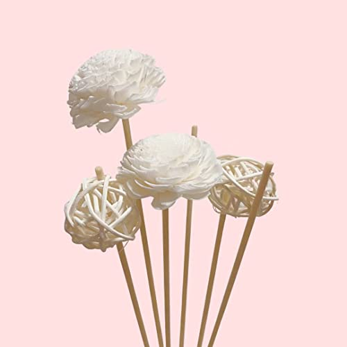 【Confezione】 30 bastoncini diffusori in fibra, 4 canne di fiori (2 arancioni + 2 bianche) e 2 decorazioni in palline di rattan.
