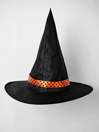 Elegante abito da strega attaccato con rivestimento in rete. Cintura in raso a pois abbinata e cappello a punta