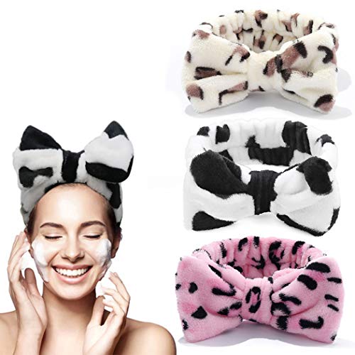 Yean - Fascia per capelli con fiocco, morbida, fascia elastica per capelli, colore: rosa leopardo per make up, doccia, spa, massaggio, yoga, sport, confezione da 3