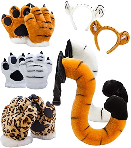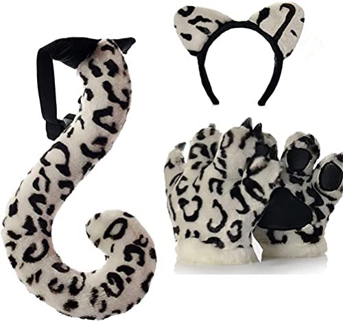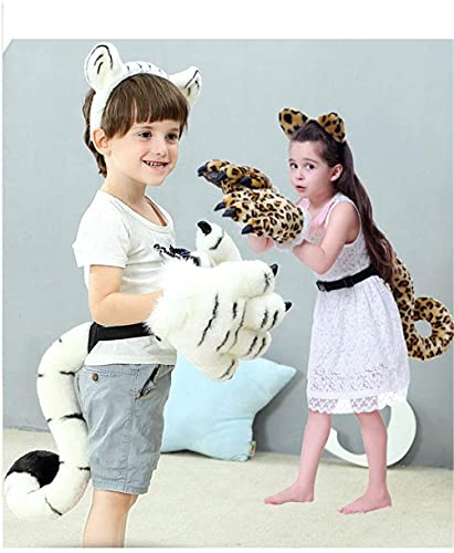 YELAN Tigre Artificiale e Zampe di Dinosauro Soffici Guanti di Peluche, Fascia per Capelli e Set di Costumi per la Coda Costume Cosplay per Bambini di Tigre o Dinosauro (Snow Leopard 3 PCS)