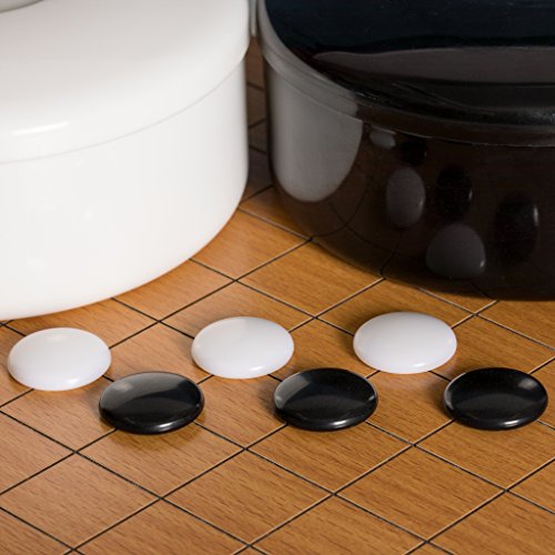 Pietre convesse: Include 181 pietre nere e 180 pietre bianche misura 3 in melamina da 5,7 x 22mm ciascuna. Queste pietre convesse producono un forte “schiocco” quando disposte con la superficie piatta sul tabellone e si possono capovolgere per simulare varianti durante la revisione di una partita. Sono incluse due ciotole in plastica per la conservazione