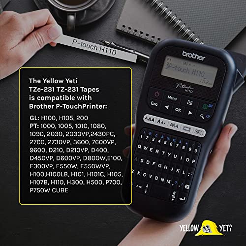 Yellow Yeti TZe231 TZe 231 TZ231 TZ 231 Nastri per Etichette sono compatibili con i seguenti modelli di stampanti per etichette: Brother P-Touch GL-H100 GL-H105 GL-200 PT-1000 PT-1005 PT-1010 PT-1080 PT-1090 PT-2030VP PT-2430PC PT-2700 PT-2730VP PT-3600 PT-7600VP 9600 PT-D210 PT-D210VP PT-D400 PT-D450VP PT-D600VP PT-D800W PT-E100 PT-E300VP PT-E550W PT-E550WVP PT-H100 PT-H100LB PT-H100R PT-H101 PT-H101C PT-H105 PT-H107B PT-H110 PT-H300 PT-H500 PT-P700 P750W CUBE