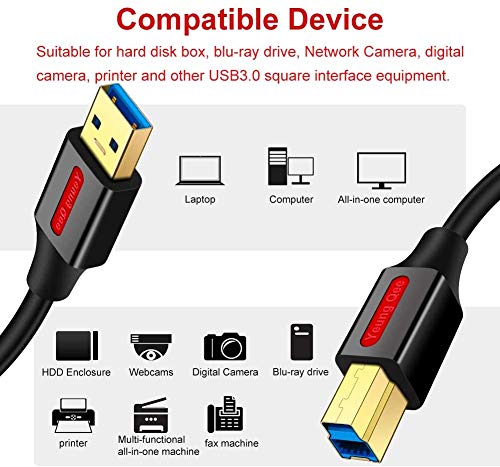 Trasmissione ad alta velocità: cavo USB A a USB B velocità di trasferimento dati fino a 5 Gb/s, 10 volte più veloce rispetto alla velocità USB 2.0, si adatta perfettamente alla porta USB 3.0 dei dispositivi. Se si desidera che la velocità di trasferimento più veloce tra il computer/laptop e il dispositivo esterno, si prega di utilizzare questo cavo.