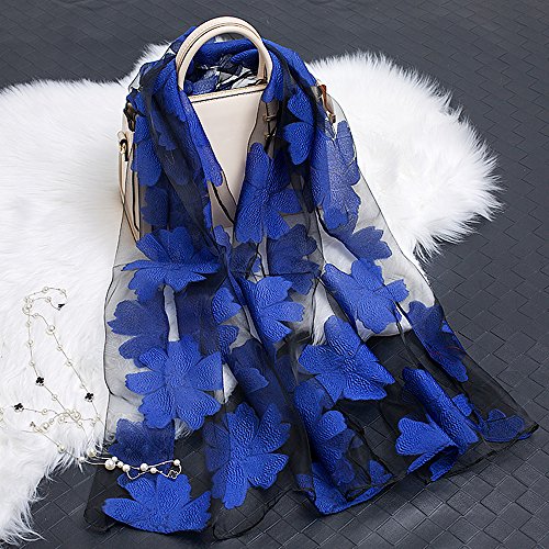 YFZYT Elegante Wrap Donna Scialle di Seta Chiffon delle Sciarpe della Sciarpa con Motivo Foglie Ricamate - Fiore Blu Reale
