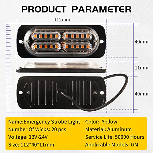 【Luci stroboscopiche 4x20 LED per auto】: ogni lampada ha 20 lampadine LED ad alta intensità super luminose, 10 W per luce, dimensioni: 112 x 40 x 11 mm, lunghezza del cavo di alimentazione: 1,1 m. Lunghezza della scatola di controllo della lunghezza del cavo: 1,5 m. durata della vita fino a 50000 ore