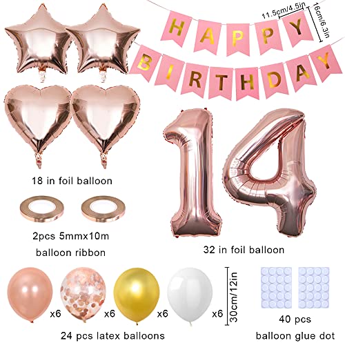 Yijunmca 31 palloncini per feste di 14° compleanno con numero 14 palloncino forma di stella stagnola palloncino lattice bianco perfetto per donne e uomini accessori per il 14° compleanno, oro rosa