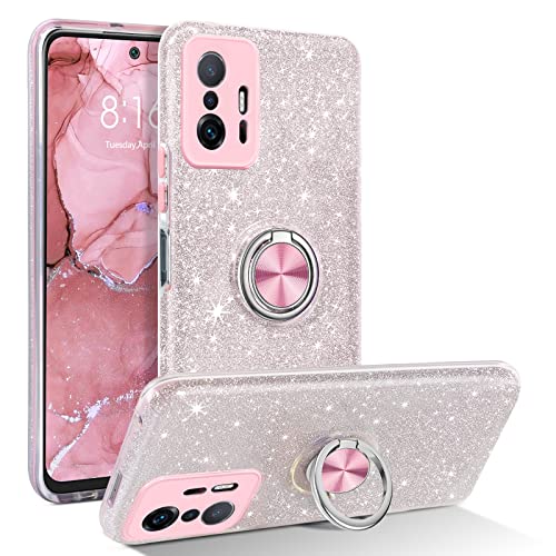YINLAI Xiaomi Mi 11T/11T Pro,Custodia in argento glitter antiurto Xiaomi Mi 11T con 360° Ring Stand Tre in Uno Supporto Magnetico per Xiaomi Mi 11T Pro - Argento Rosa