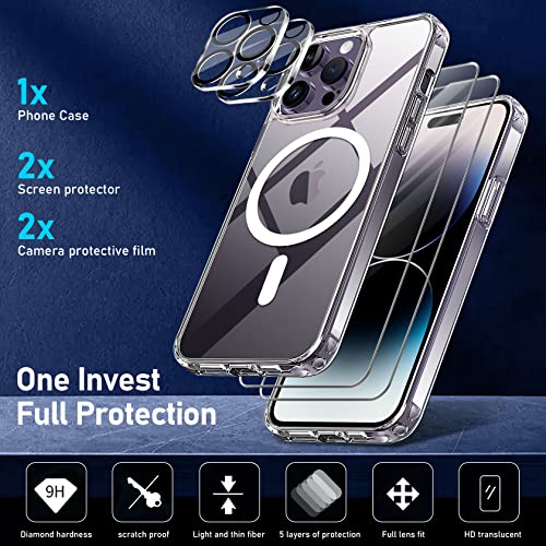YisrLery 5 in 1 per Magnetica Cover iPhone 14 Pro Max con 2 Vetro Temperato e 2 Vetro Fotocamera, Compatibile MagSafe Hard PC Anti-Graffio Case Antiurto Custodia con Bumper TPU (Trasparente)