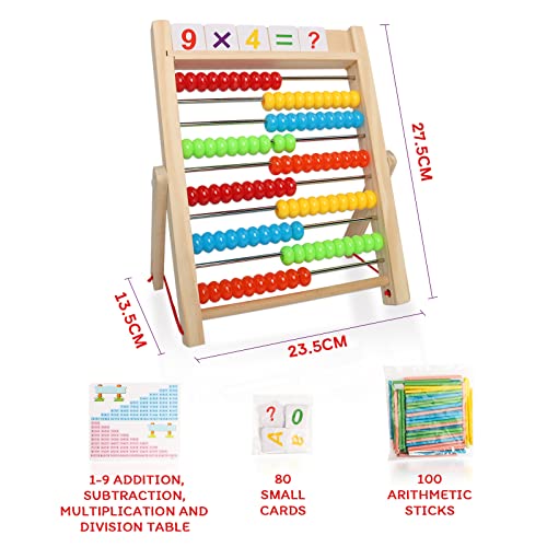 【Cosa si ottiene】 Set di abaco che include 1 abaco di legno che misura 23*14*27.5cm. 52 carte di lettere maiuscole e minuscole, 21 carte di numeri (0-20), 7 carte di simboli, 100 bastoncini per contare e 1 foglio di algoritmi.