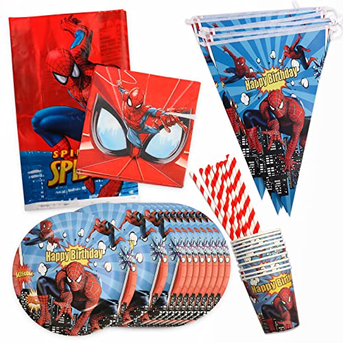 Yisscen Set di Stoviglie per Compleanno, 52pcs Spiderman Decorazione, Stoviglie per Feste Forniture Tovaglia Bicchieri Piatti Tovaglioli, Decorazione per Festa Spiderman Compleanno Per Bambini