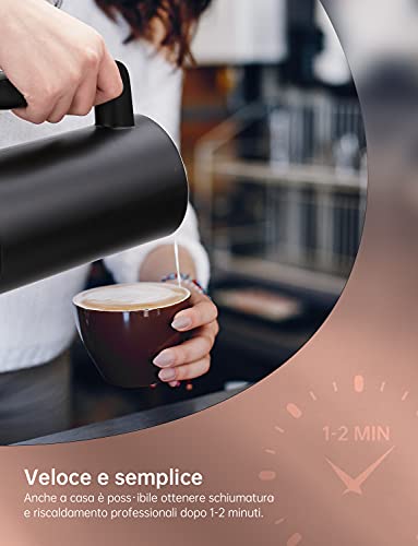 【Silenzioso, Veloce e Sicuro】Il montalatte elettrico cappuccino funziona silenziosamente e velocemente. E' possibile ottenere una schiuma di latte perfetta in 50-120 secondi per ottenere un delizioso latte o cappuccino. Si consiglia di utilizzare latte intero (contenuto di grassi> 3%) per ottenere il miglior effetto di schiuma. Quando la schiuma di latte è pronta, il termoregolatore si spegnerà automaticamente, rendendolo più sicuro da usare.