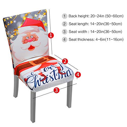 Materiale di alta qualità: set di 4 coprisedia Materiale: poliestere + spandex, realizzati in tessuto di alta qualità con elevata elasticità, che copre meglio la sedia. Questo coprisedia è perfetto per cucina, camera da letto, soggiorno, ufficio o hotel, ricevimento di nozze, celebrazioni, cerimonie e molto altro ancora. Il Natale è alla porta e sarebbe una fantastica decorazione natalizia
