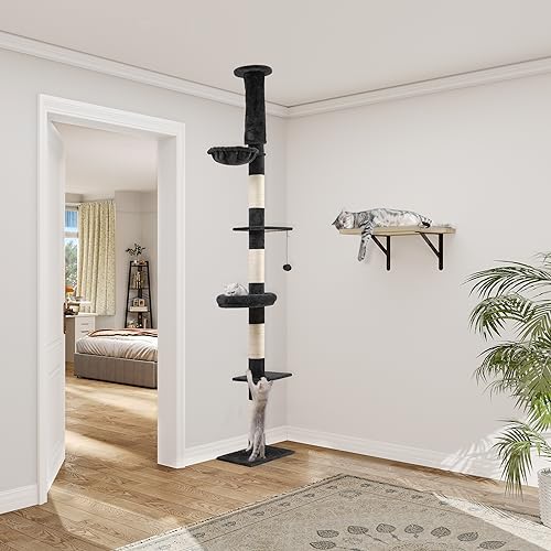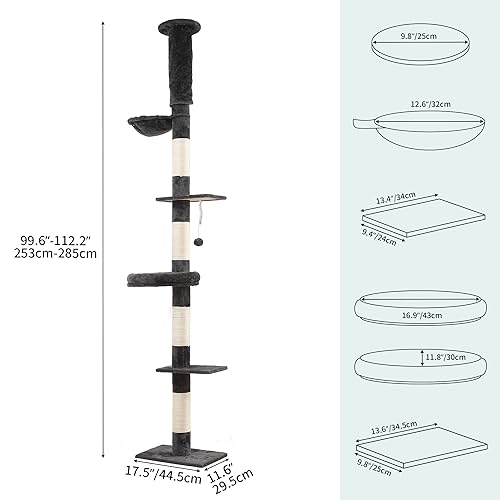 YITAHOME Albero Tiragraffi per Gatti da Terra Fino al Soffitto, 5 Livelli Torre per Gatti, Tiragraffi per Gatto con Altezza Regolabile/Amaca/Piattaforme/Pali in Sisal/Pompon, Grigio Scuro, 281 cm