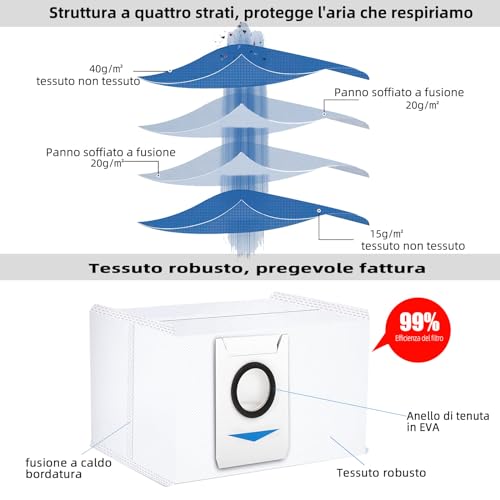 【Elevata Efficienza di Filtrazione】Il sacchetto per aspirapolvere è dotato di un filtro a quattro strati (non tessuto + 2 * panno soffiato a fusione + non tessuto) che può filtrare efficacemente il 99% delle particelle di polvere e allergeni fino a 2,5 µm. l filtri HEPA hanno buone capacità di filtrare fino al 99,5% di sporco, polline, piccole particelle di polvere e sostanze. Puoi proteggere efficacemente il tuo aspirapolvere Ecovacs ed evitare che l'aria che respiriamo venga inquinata.