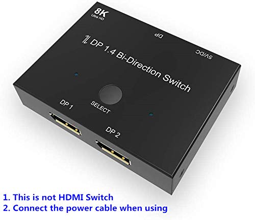 Bi-Direction DP Switch:The DisplayPort switcher allow you to connect two DP source to one DP display or connect one DisplayPort source to toggle between two displays. (IMPORTANT NOTE:Two displays CANNOT display simultaneously)(While connecting to Source or Display,you must use the usb cable to power the splitter,If you do not power the splitter,your source or display can not show anything)