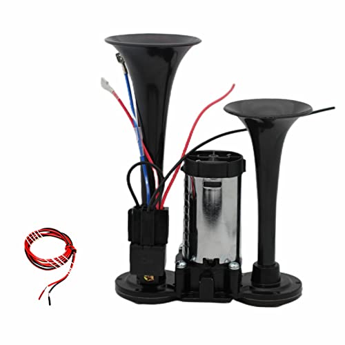 ✔♥ Il corno a doppio tubo aggiornato ha una velocità di risposta più rapida e una potenza più forte. Altoparlante di grande calibro 24V, design a doppio tubo, suono più forte, maggiore diffusione! Il design unico, simile al suono profondo di un rimorchiatore o di un clacson del treno, rende la guida più sicura. Il suono è molto forte, si prega di non usarlo vicino a scuole o ospedali.