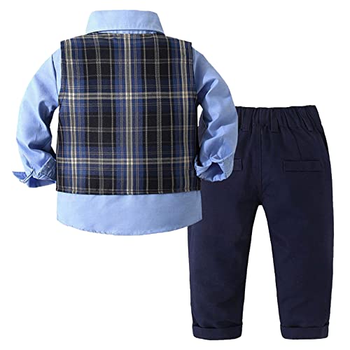 YiZYiF 3 Pezzi Bambini Set di Vestiti Gentile Formale Camicia con Papillon + Gilet + Pantaloni Abiti da Smoking Tuta per Festa Compleanno Cerimonia Nozze Completino Blue Plaid 18-24 Mesi