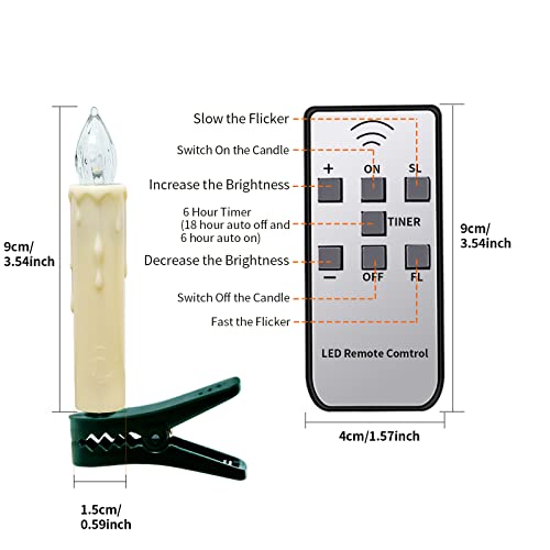 Candele a clip per alberi di Natale: La confezione include: 30 candele natalizie [Dimensioni candele: D 1,5 x H 9 cm], 30 clip, 30 anelli impermeabili, 1 telecomando a 7 tasti. Ogni candela è alimentata da una batteria alcalina AAA (non inclusa).