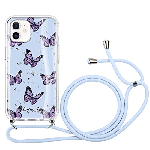 Yoedge Glitter Cover per iPhone 12 Pro/iPhone 12 6,1" con Cordino,Trasparente Morbido Silicone Custodie Marmo Disegno,Rigida PC Antiurto Brillantini Case con Laccio Tracolla per iPhone12,La Farfalla