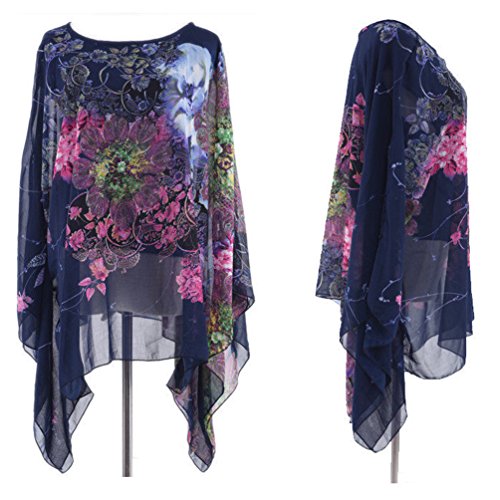 YOKIRIN Camicia Chiffon Girocollo Camicetta Donna Chiffon di Estate Stampa T-Shirt Manica a Pipistrello Sciolto Blusa Irregolare (Blu Scuro)
