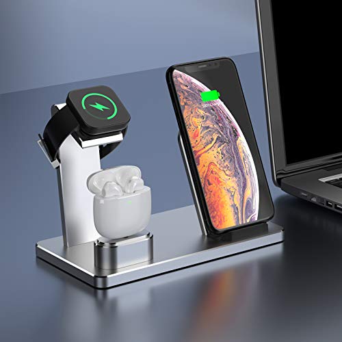 YOMENG Stazione di Ricarica Wireless, Dock di Ricarica Rapida in 3 in 1 iPhone 12/12 Pro/12 Mini/11 PRO Max/X/XS/XR/XS Max/, Supporto per Caricabatterie per iWatch Series 6/5/4/3/2/1(Argento)