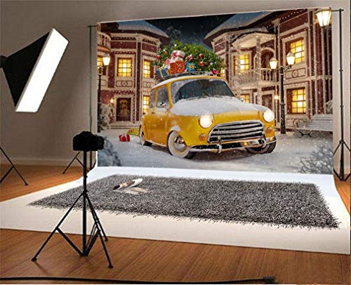 YongFoto 3x2m Sfondo Fotografico Natale Vecchi regali auto Ramoscelli pino Forte nevicata Costruire House Winter Night Fondale Foto Festa Bambini Boby Nozze Adulto Partito Studio Fotografico Puntelli