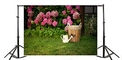YongFoto 3x2m Sfondo Fotografico Primavera Ric Coutyard Blooming Flowers Natura prato dell'erba verde dell'annaffiatoio secchio legno Fondale Foto Festa Bambini Boby Nozze Adulto Partito Studio