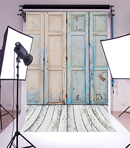 YongFoto 1,5x2,2m Vinile Sfondo Fotografico Shabby, blu Porta di Legno e White Wood Floor Vuoto Interno di Legno Fondale Foto Festa Bambini Nozze adulto Partito Studio Fotografico Puntelli