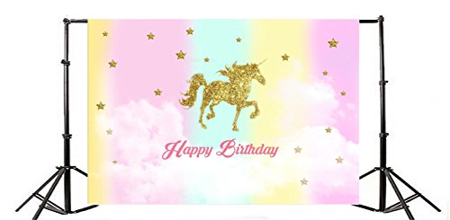 YongFoto 2,2x1,5m Vinile Sfondo Fotografico Unicorno D'Oro Stelle Lucenti Rosa Dolci Nuvole Cielo Fondale Foto Compleanno Festa Baby Shower Bambini Bambino Ragazze Bandiera Studio fotografico puntelli