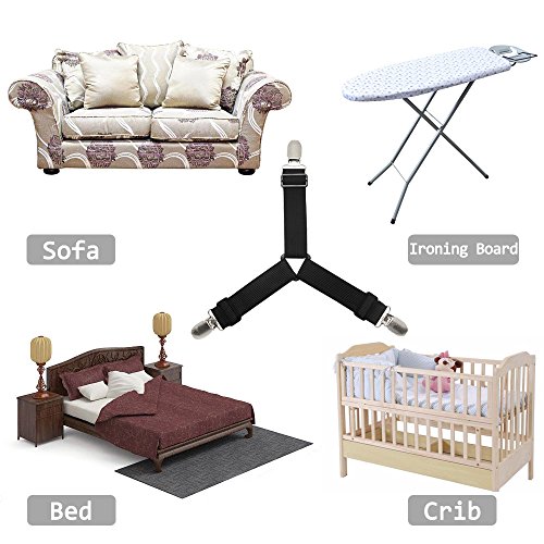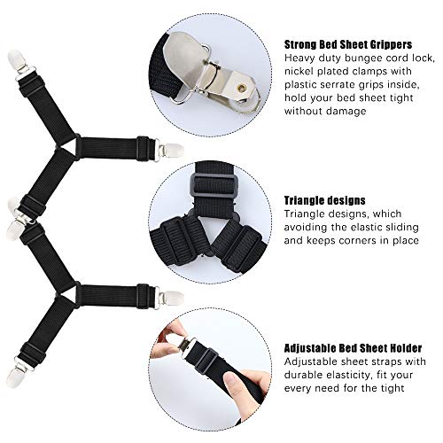 Yotako Set di 4 cinghie elastiche a triangolo per lenzuolo con angoli, regolabili, con morsetti di aggancio