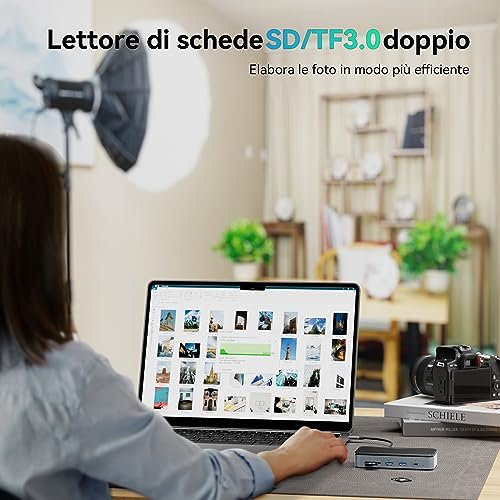 【Doppio lettore di schede SD/TF 3.0】 Hub USB Supporta la lettura simultanea di schede SD/TF, riducendo della metà il tempo di lavoro. La velocità massima di lettura e scrittura è di 104 MB/s, il che migliora notevolmente l'efficienza del lavoro. Plug and play, semplifica il trasferimento di video e foto da una fotocamera a un computer, anche in viaggio.