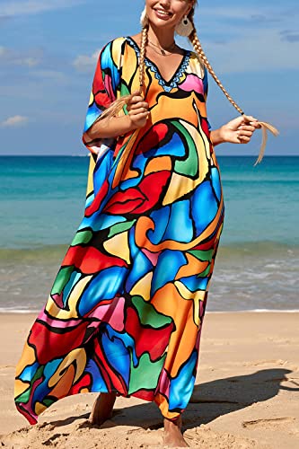 YouKD Caftano lungo da donna, cardigan bohemian, da spiaggia, costume da bagno copertura up abito plus size, B blu, giallo, rosso, Taglia unica