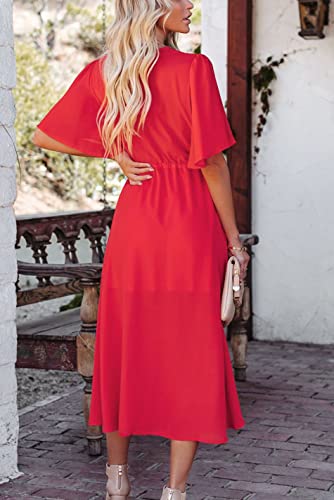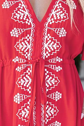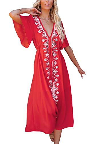 YouKD Estate Cotone Floreale Lungo Kaftano Boemia Kimono Beach Costume Da Bagno Coprire Maxi Vestito per Le Donne, Rosso D, Taglia unica