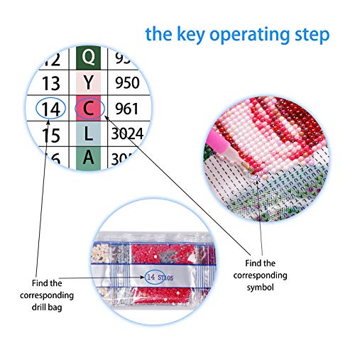 Facile da usare: i numeri sono stampati sui pacchetti di diversi colori e i numeri diversi corrispondono a lettere diverse. Quindi premere i diamanti sulla lettera corrispondente. L'uso di un libro o di un cartone per rafforzare la pressione dopo che tutto è fatto, rende i diamanti intarsiati più saldi.