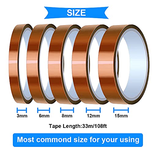 Youmile 5 rotoli di nastro per alte temperature Nastro termoresistente in poliimmide 3/6/8/12/15 mm x 33 m(108 piedi) Nastro termico per saldatura con 2 rotoli 15 mm x 10 m (33 piedi) Nastro in teflon