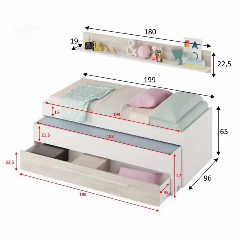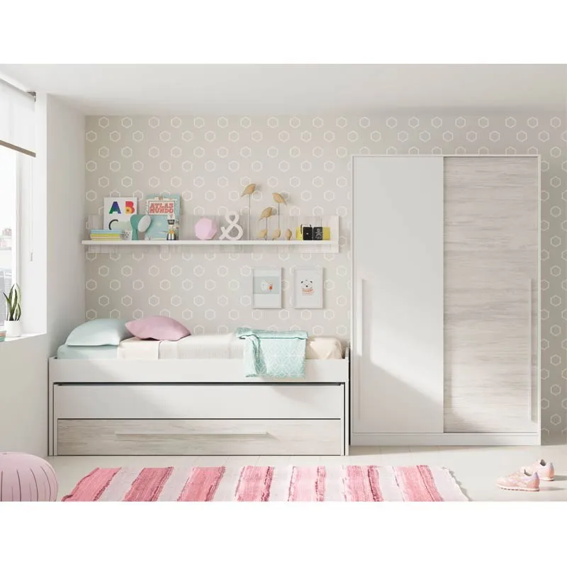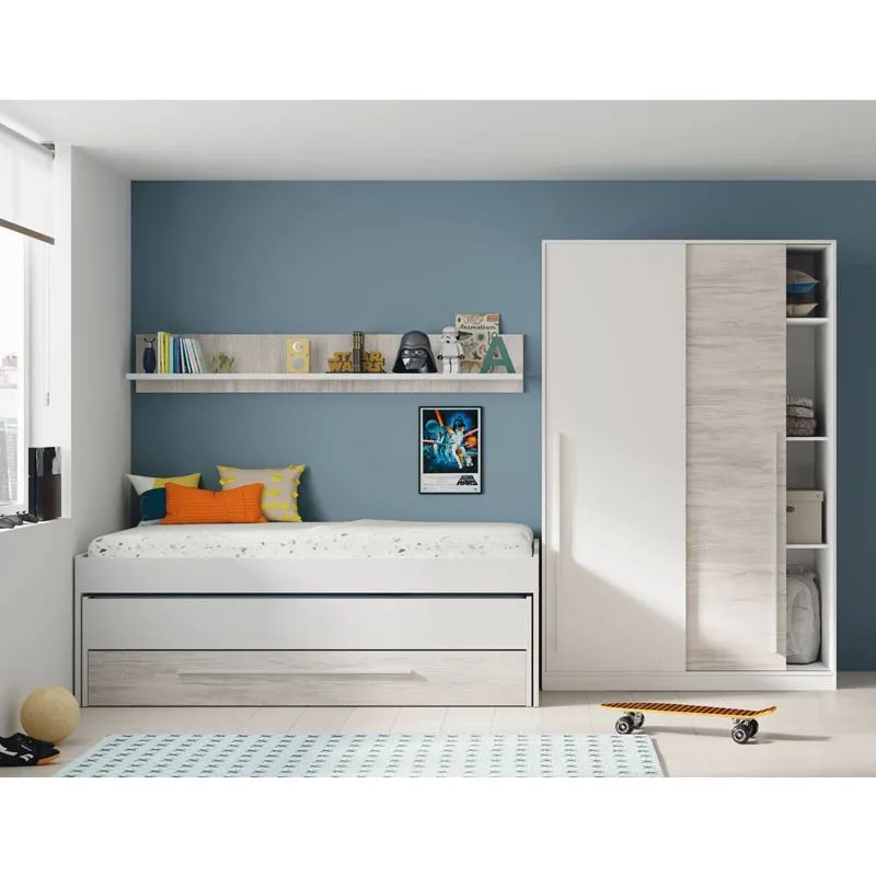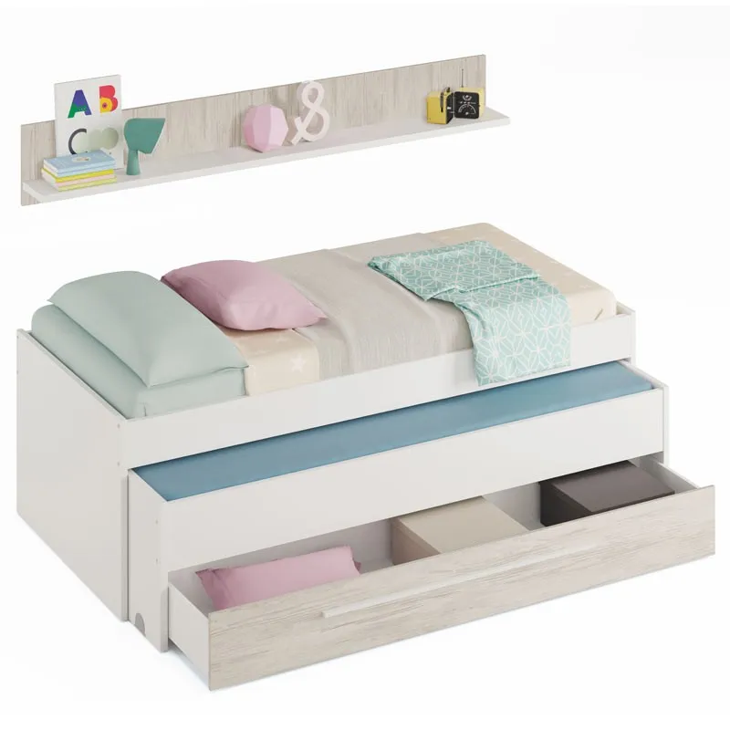 Youth nest bed, two beds + drawer + child shelf in white Artik and white Velho 199x96x65