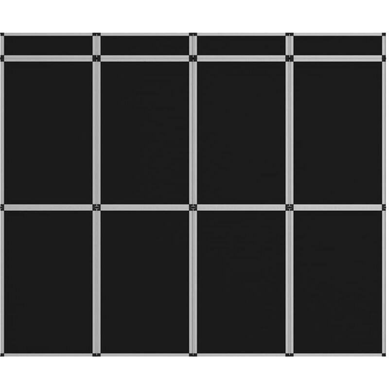 Questa parete può essere utilizzata come divisorio o come parete di presentazione per fiere. I poster pubblicitari e promozionali possono essere facilmente attaccati al muro della mostra, che funge quindi da sistema gigante di visualizzazione. Quattro intestazioni superiori aggiuntive consentono di mostrare il nome dell'azienda o altre informazioni importanti. Realizzato in lega di alluminio di qualità e pannello in PP, questa parete espositiva è resistente e stabile. Il pannello espositivo può essere assemblato e posizionato in diverse forme per soddisfare le diverse esigenze estetiche. Quando non in uso, può essere facilmente smontato e piegato per una facile conservazione. Colore: Nero Materiale: Lega di alluminio, cartone PP Dimensioni complessive: 242 x 200 cm (L x P) Dimensioni del pannello dell'intestazione visibile: 14,5 x 54,5 cm (L x P) Dimensioni dell'area visibile del pannello singolo: 84,5 x 54,5 cm (L x P) Con 8 pannelli e 4 intestazioni extra Pieghevole: Si Assemblaggio
