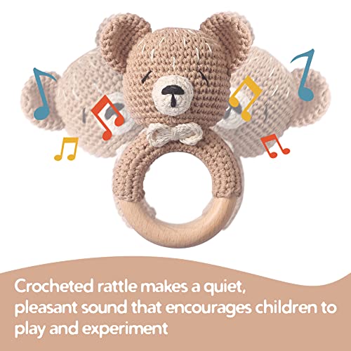 Youuys Giocattolo Sonaglio Neonati in Legno, Con Suono, Massaggiagengive All'uncinetto, Giochini Dentizione Neonati, Animali Morbidi Giocattoli, Regalo per Neonati Bambini (Orso Khaki)