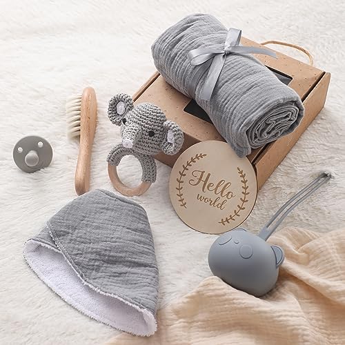 Youuys 6 Pezzi Regalo Set per Neonato, Regalo per Bambino e Bambina, Asciugamano da Bagno, Sonaglio, Giocattolo in Legno, Cartoline, Calzini, Spazzola, Baby Shower (Elefante-2)