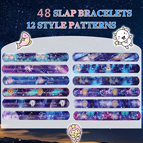 Varietà stili: 12 braccialetti zodiacali set di bomboniere include 48 pezzi braccialetto schiaffo con 12 diversi disegni di stile.