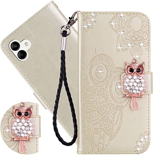 Ysnzaq Custodia per Samsung Galaxy A04 6.5" Cover, Gufo Rilievo Glitter Diamanti Flip Pelle PU Custodia Libro Magnetica Portafoglio Caso per Samsung Galaxy A04 YK Gold.