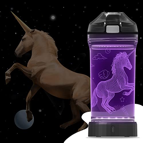 DESIGN figo. Bottiglia d'acqua + luce notturna + motivo unicorno (3 IN 1). La bottiglia d'acqua leggera è una combinazione di arte e tecnologia che crea un'illusione 3D ottica e sfida la mente. Scegli tra molti temi divertenti: dinosauro, cane,hockey, gatto, unicorno e altro. Questa è una grande idea da regalo, prenderla con la fiducia che ogni familiare o amico è sicuro di amare e di usarla per gli anni a venire.